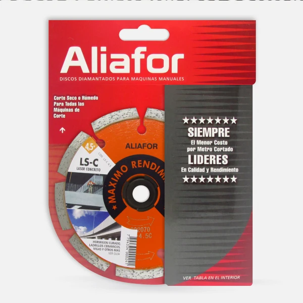 El Disco Diamantado Aliafor LS-C 4.5″ está diseñado para ofrecer un corte agresivo, rápido y eficiente en materiales de obra. Gracias a su tecnología de segmentación láser, garantiza una resistencia superior a altas temperaturas y presiones, logrando un rendimiento constante incluso en trabajos intensivos.